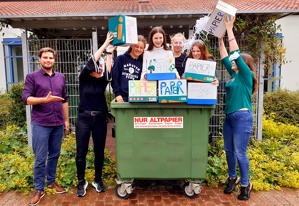 Die Teilnehmerinnen des UNESCO-Wahlkurses haben in den ersten Wochen des Präsenzunterrichts ihr während des Distanzunterricht geplantes Projekt zum Müllmanagement am Maristen-Gymnasium gestartet. Im ersten Schritt wollen wir in den Klassenzimmern der 8. Klassen mit selbstgestalteten Papier-Mülleimern das Papier vom restlichen Müll trennen.