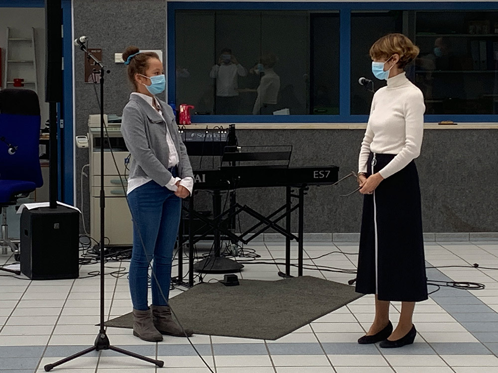 erzählte, wie sie vom Maristen-Gymnasium und besonders von einzelnen Lehrkräften geprägt worden sei. Sie persönlich habe viel von der Internationalität der Schule mitnehmen können durch Austauschprogramme mit Frankreich, Spanien und Québec, aber auch durch viele internationale Projekte, die sie an der Schule mitorganisiert hat. Besonders in Erinnerung geblieben sei ihr die gemeinsame UNESCO-Projektreise nach Paris, auf der die MGF-Gruppe sogar Gelegenheit hatte, den damaligen ZDF-Frankreichkorrespondenten Theo Koll kennenzulernen.