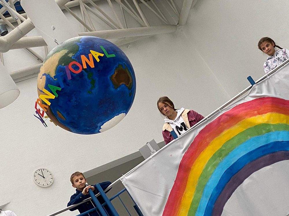 Gut sichtbar hängt er seit heute Vormittag in der Aula und zeugt vom internationalen Engagement des Maristen-Gymnasiums: Der nagelneue MGF Globus, den unsere frühere Schülerin und UNESCO-Schülerbotschafterin Elena Goldhofer ihrer Schule quasi als „Abschiedsgeschenk“ hinterlassen hat. Und natürlich wurde das kostbare Stück, das Elena mit so viel Liebe zum Detail erstellt hat, nicht „einfach so“ aufgehängt – dafür steckt viel zu viel Mühe und auch Liebe in dem Globus.