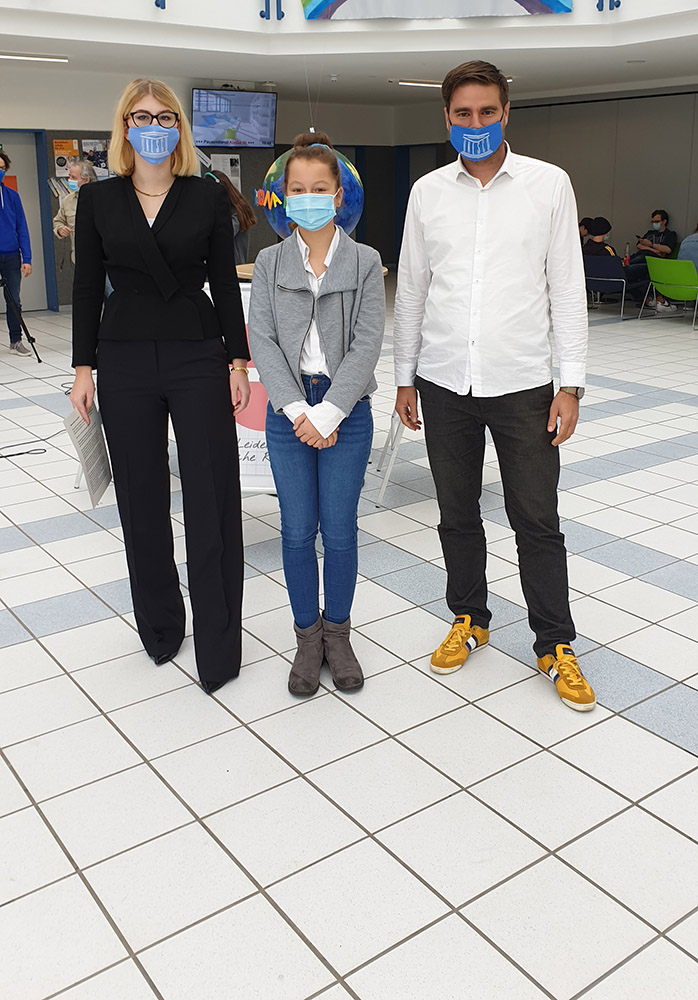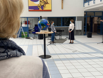 Vor allem aber habe sie am Maristen-Gymnasium immer ein unterstützendes Umfeld um sich gehabt und Rückhalt auch in schwierigen Situationen gespürt. Sie sei, so Elena, in dieser Schule erwachsen geworden und sei nun bereit dafür, die Welt zu erobern; dass an „ihrer“ Schule nun „ihr“ MGF Globus mitten in der Aula hängt, erfülle sie mit großem Stolz. Als kleine Geste überreichte sie der UNESCO-Nachwuchsbotschafterin Amaya noch ein selbstgestaltetes UNESCO-Notizbuch und wünschte ihr viel Erfolg und viele neue Ideen.