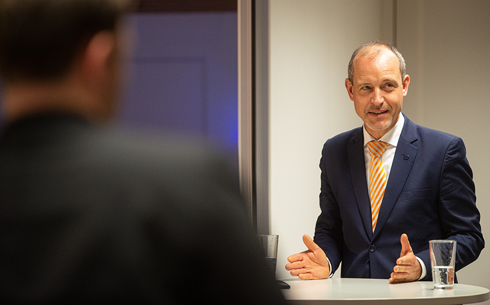 Zu einer Podiumsdiskussion trafen sich unter anderem Dr. Jörg Wojahn von der EU-Kommission (links), Schulleiter Christoph Müller (3.v.r.) und Landrat Peter Dreier (2.v.r.) am Maristen-Gymnasium.