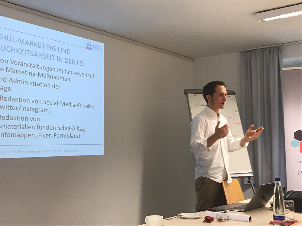 Erneut für das Katholische Schulwerk in Bayern (KSW) unterwegs waren den ganzen Montag über Schulleiter Christoph Mülller und Matthias Spanrad aus der Erweiterten Schulleitung. Beide referierten – bereits das zweite Jahr in Folge – für interessierte Teilnehmer zum Thema "Öffentlichkeitsarbeit und Marketingmaßnahmen" an Schulen in kirchlicher Trägerschaft. Beispielsweise ging es darum, verschiedene Ansätze und Maßnahmen vorzustellen, mithilfe derer Schulen ihren öffentlichen Auftritt und den Schulalltag ergänzen können. Müller und Spanrad stellten dabei zum einen ihre in den vergangenen Jahren gesammelten Erfahrungen und Materialien vor, etwa alle Maßnahmen rund um den Anmeldeprozess am MGF oder auch die Begleitung des Aktionstages für Grundschüler etwa. Zum anderen gaben die Referenten aus Furth den Teilnehmern aus ganz Bayern Handlungsempfehlungen und -vorschläge mit auf den Weg, die die jeweiligen Schulen individuell umsetzen können. Auch das Thema Datenschutz und der Umgang mit sensiblen Schülerinformationen und -bildern wurde zusammen mit den Teilnehmern rege diskutiert. Zahlreiche Rückfragen der Teilnehmer belegten das Interesse am Bereich des Marketings und der Öffentlichkeitsarbeit. "Wir danken auch dem KSW", resümierte Schulleiter Christoph Müller, "dass wir erneut über dieses doch immer zentralere Thema referieren durften."