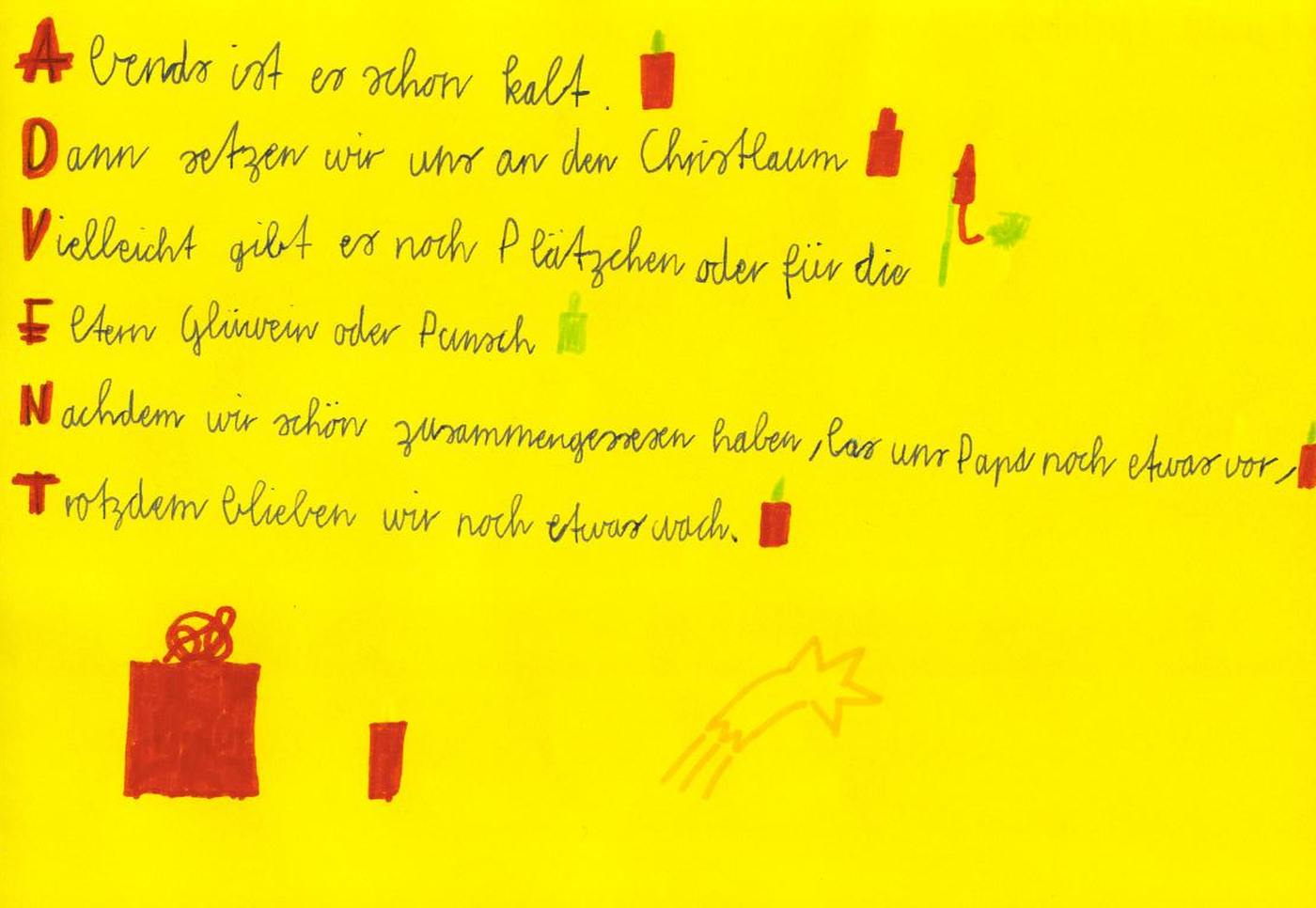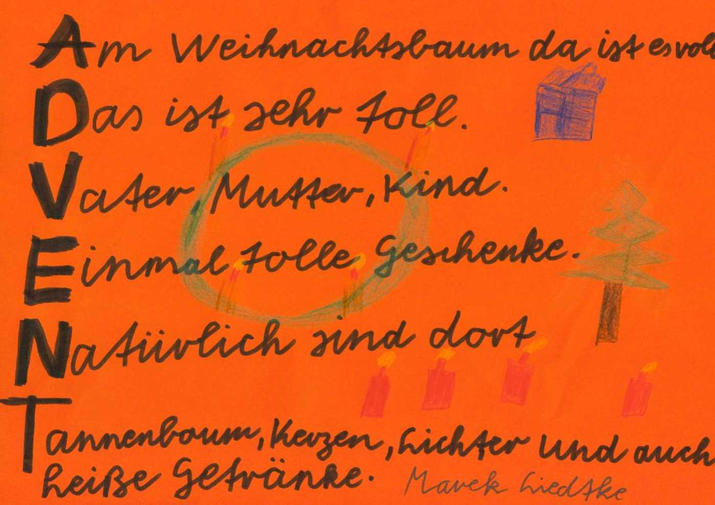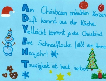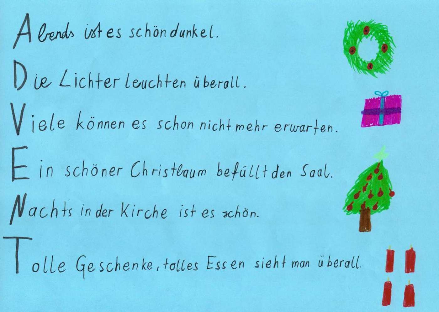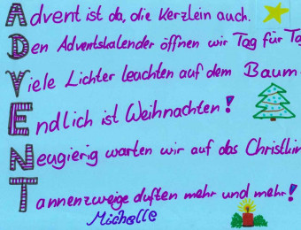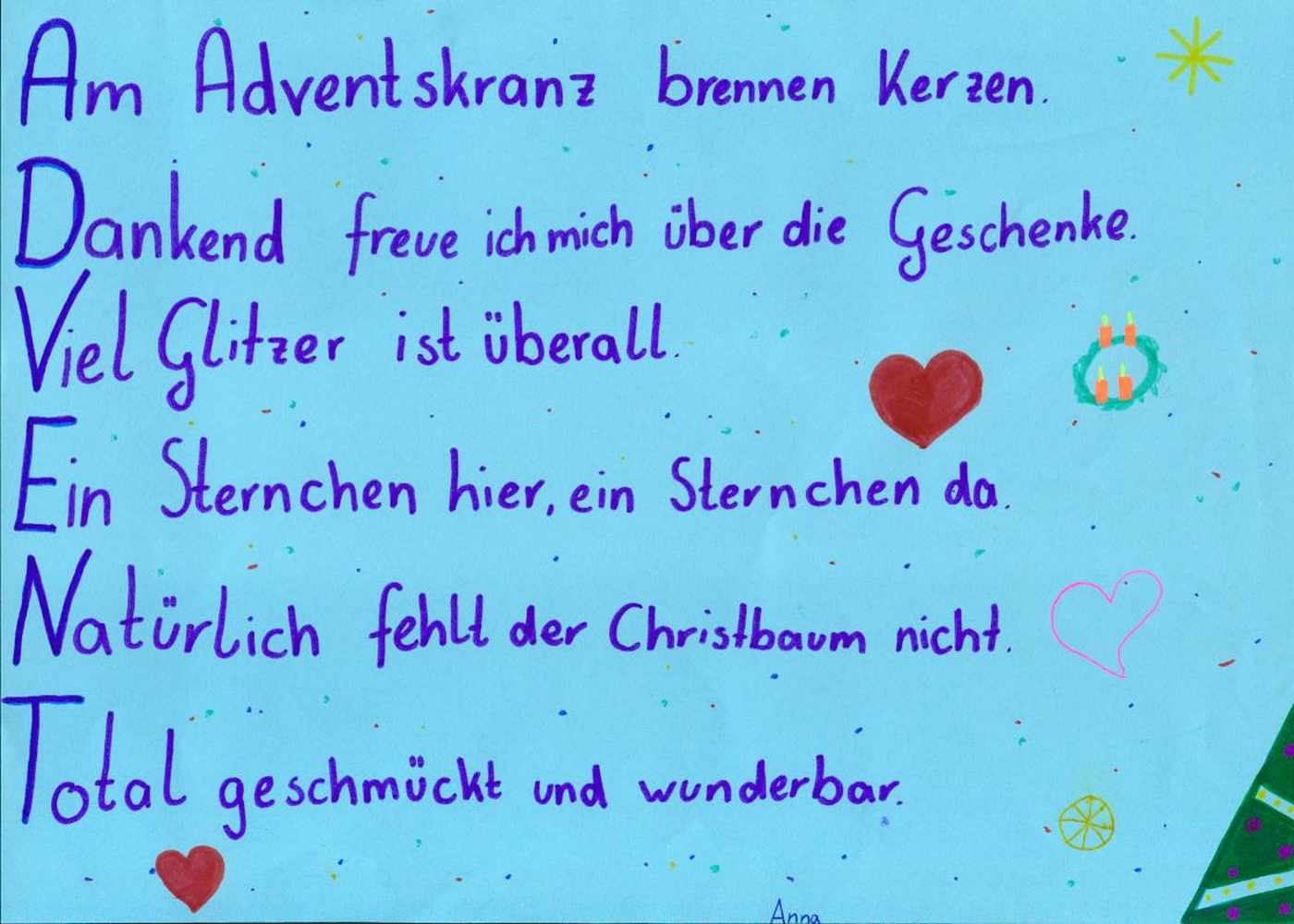 Wir, die Schülerinnen und Schüler der Klasse 5a, haben im Deutschunterricht Akrostichen zum Thema „Advent“ verfasst. Unsere Gefühle und Gedanken dazu haben wir in Form von Gedichten und Bildern festgehalten. Es hat uns viel Freude bereitet, kreativ mit unserer Sprache umzugehen und ein poetisches Werk zu erstellen.