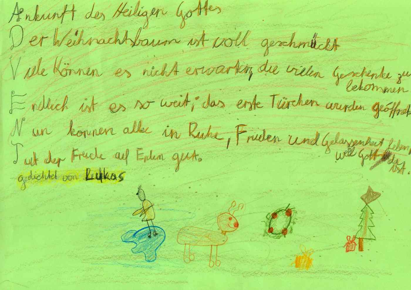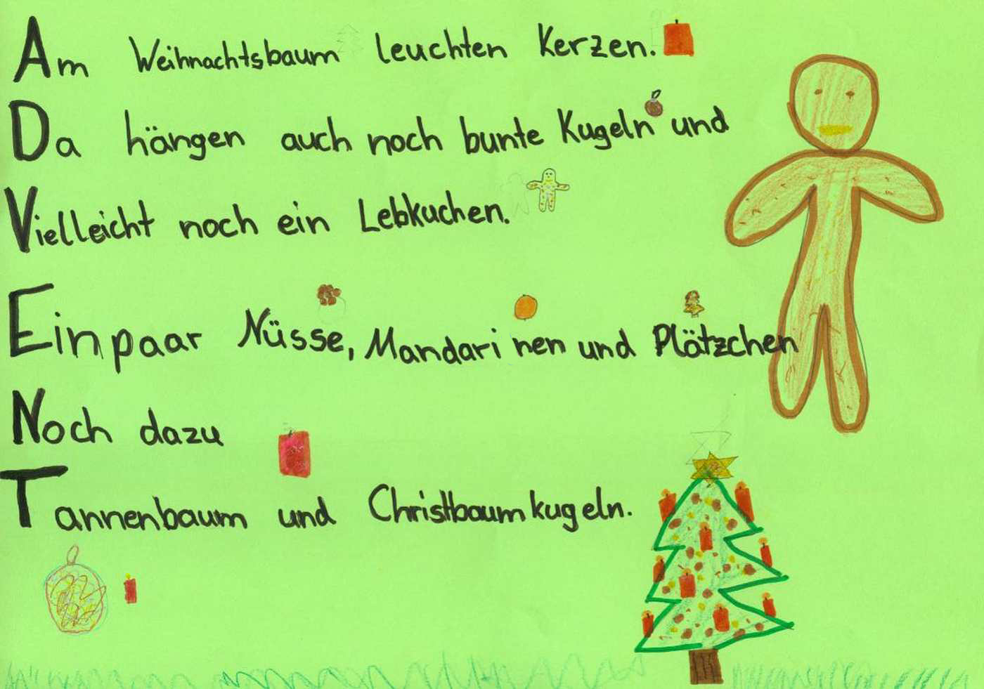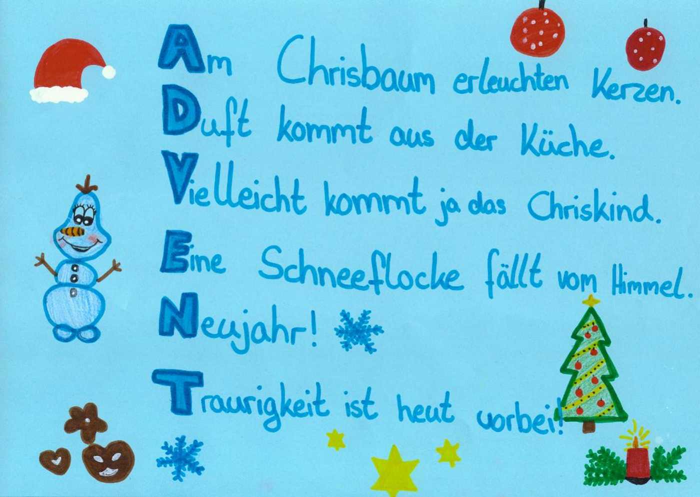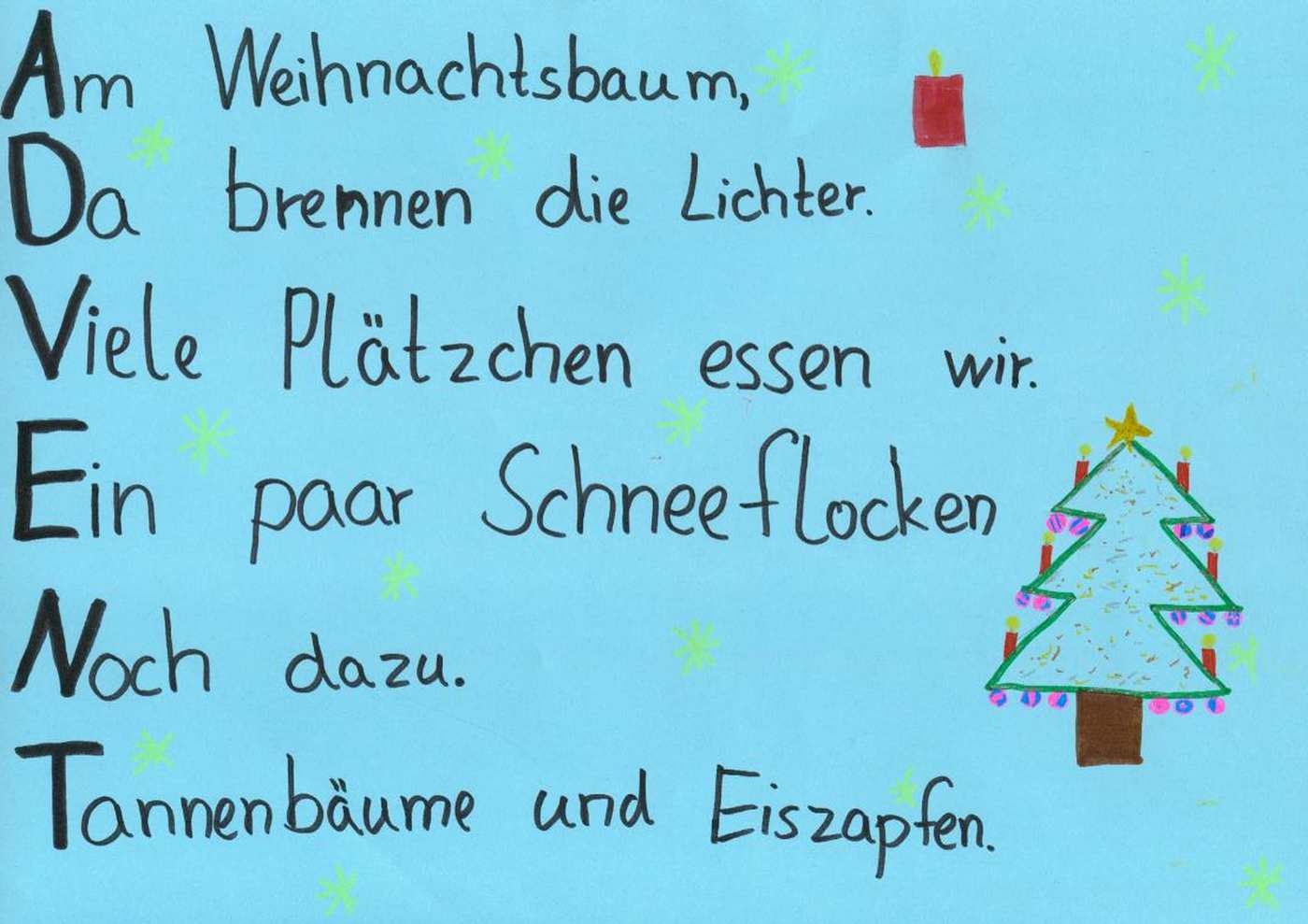 Wir, die Schülerinnen und Schüler der Klasse 5a, haben im Deutschunterricht Akrostichen zum Thema „Advent“ verfasst. Unsere Gefühle und Gedanken dazu haben wir in Form von Gedichten und Bildern festgehalten. Es hat uns viel Freude bereitet, kreativ mit unserer Sprache umzugehen und ein poetisches Werk zu erstellen.