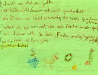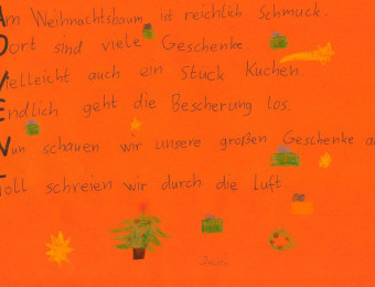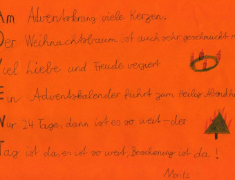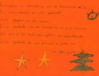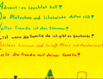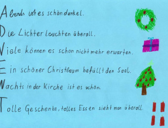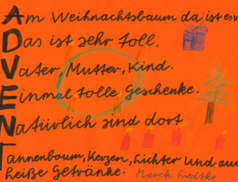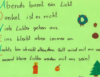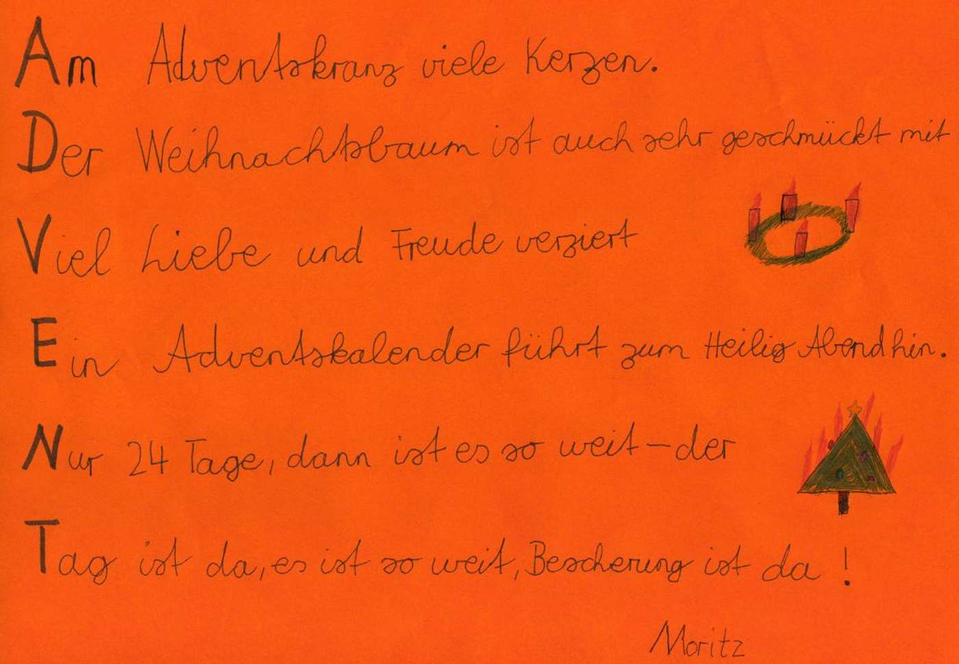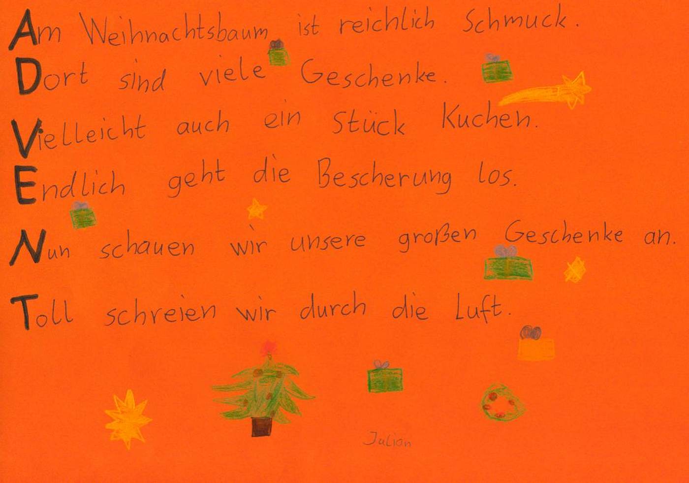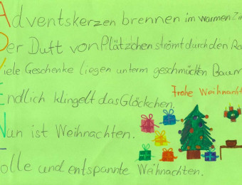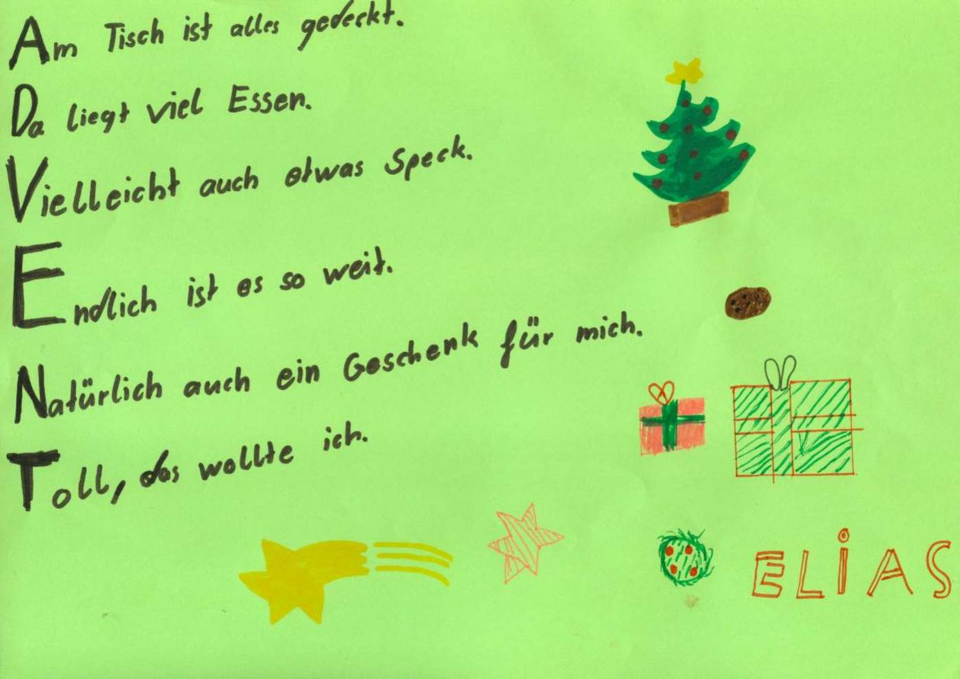 Wir, die Schülerinnen und Schüler der Klasse 5a, haben im Deutschunterricht Akrostichen zum Thema „Advent“ verfasst. Unsere Gefühle und Gedanken dazu haben wir in Form von Gedichten und Bildern festgehalten. Es hat uns viel Freude bereitet, kreativ mit unserer Sprache umzugehen und ein poetisches Werk zu erstellen.