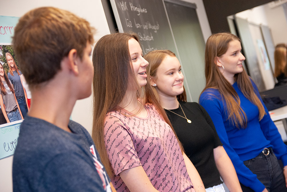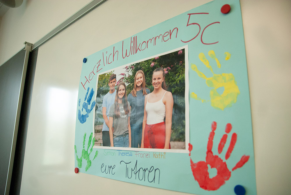 Doch langweilig wurde den 139 Schülerinnen und Schüler nicht. Zum einen gab's an sich viel zu entdecken im neuen Schulhaus, zum anderen kamen kurz vor der Pause auch noch die Tutoren vorbei, um sich vorzustellen und die Fünftklässler zu einer Schulhausführung abzuholen. Darüber hinnaus teilten die Klassleiter die ersten Bücher aus, erläuterten den Stundenplan und auch einzelne Fachlehrer stellten sich bereits vor. Und auch ein Begrüßungsgeschenk bekamen die neuen Schülerinnen und Schüler der fünften Klasse: ein Sportsackerl aus fairgehandelten Materialien. Vielen Dank an den Förderverein für die großzügige Spende. Zudem hatten die Tutoren goldige Namens-Buttons vorbereitet.